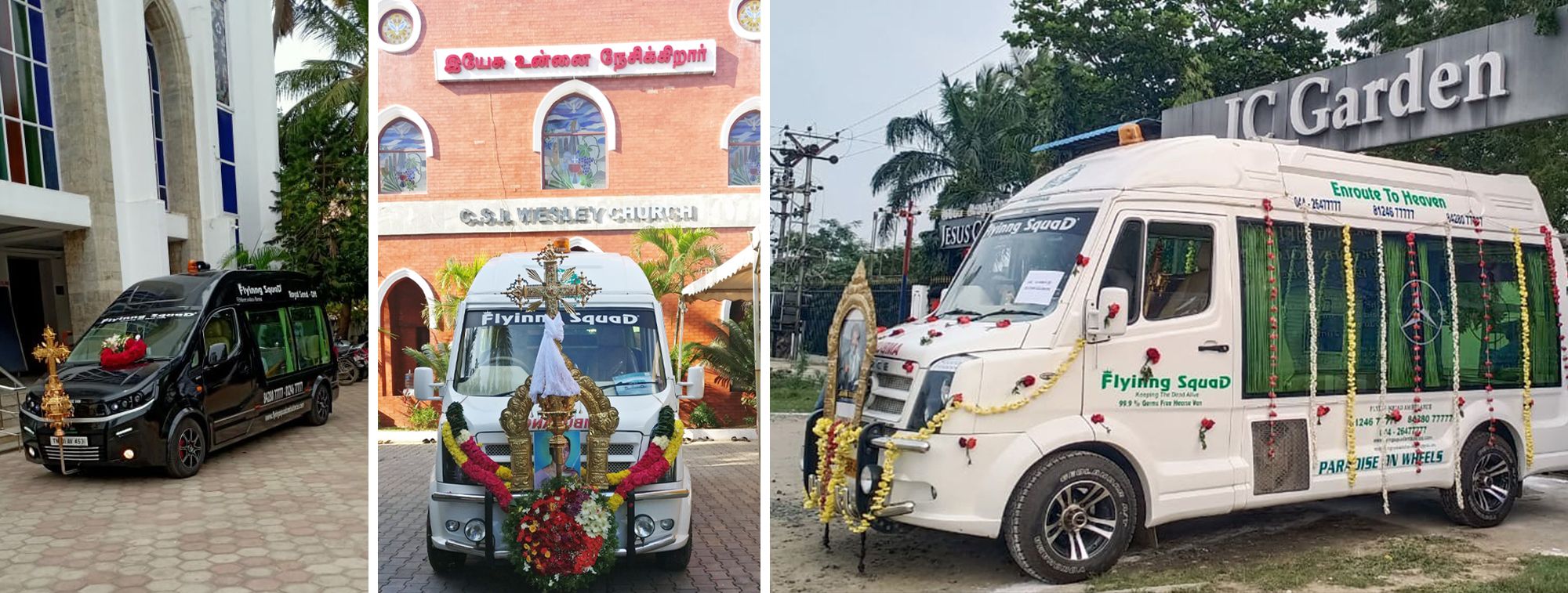 In general the Vehicle available and used for this purpose in Chennai is not up to the mark, shabby and no room & space for relatives or friends to travel with the beloved one to the Cemetery or Graveyard. Therefore we decided to build a good vehicle for this purpose. At present we have four Special Funeral Van each one is unique and special. We are very grateful to the people of Chennai to give us a great and warm reception for this idea