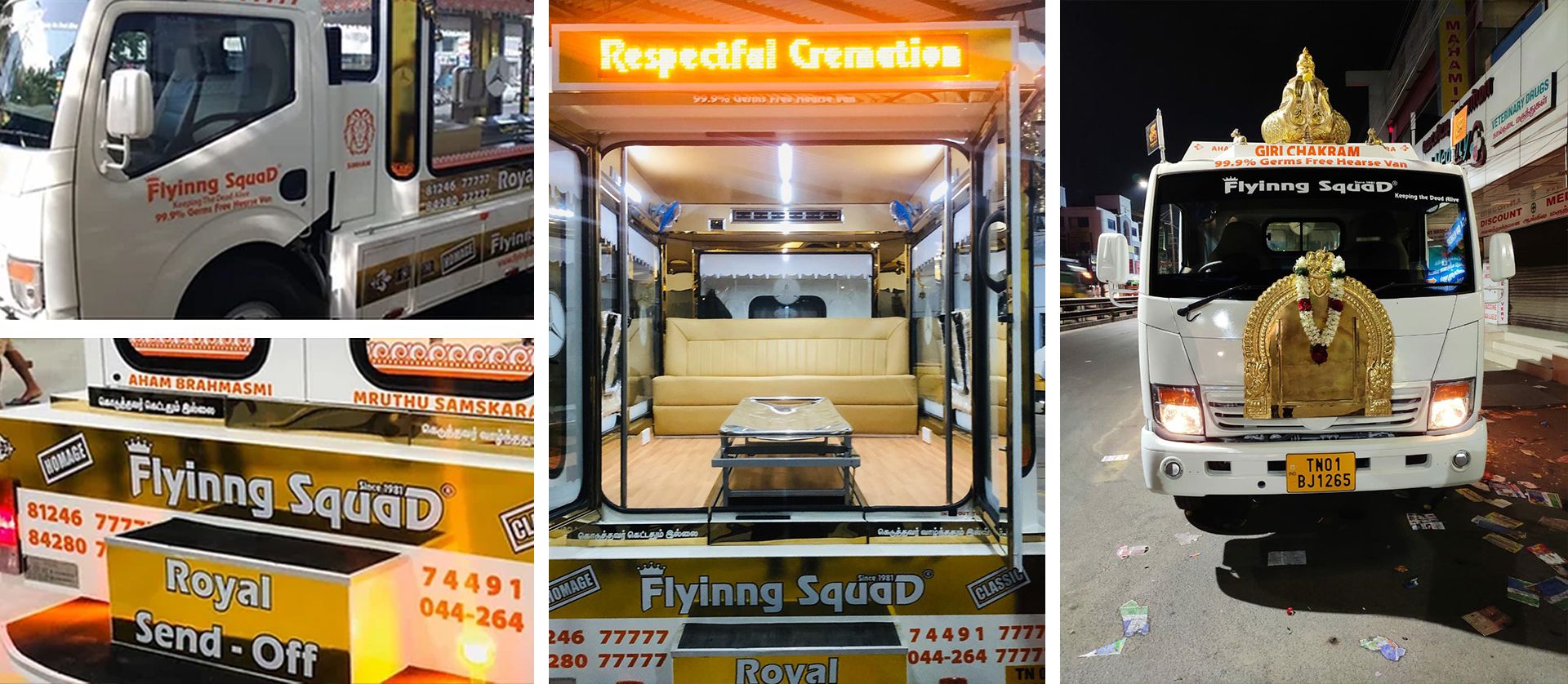 Give a Royal Send-Off for Your Departed Loved Ones. Flyinng SquaD Ambulance Service & Homage Funeral Service, Chennai offers Hi-Tech Funeral Van to make the Funeral Procession in a Elegant & Grand manner at a very affordable cost. This Van is completely covered with Glass on 3 sides for clear vision from outside. This is an elegantly designed van which has Automatic Slider for smooth handling of the placing the deceased in the Van, Live Video Streaming, Fully Air-Conditioned