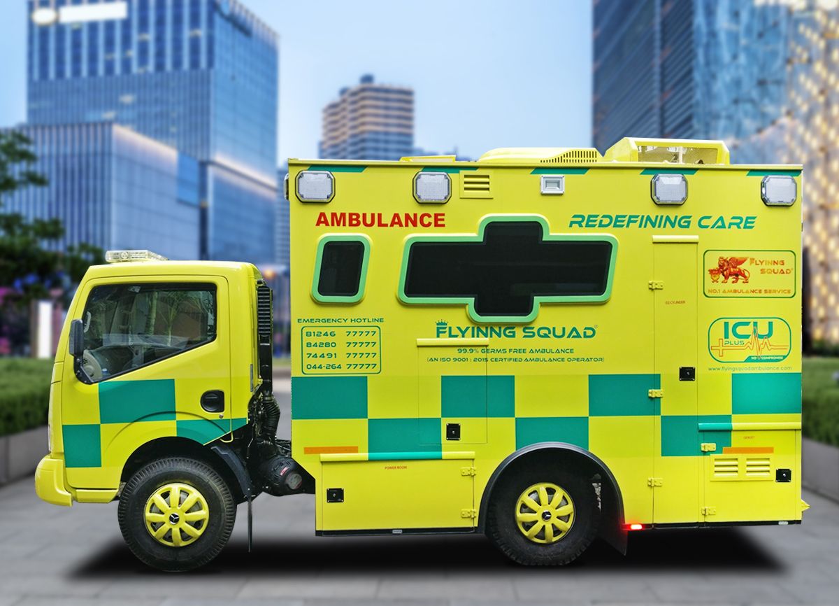 We need a Fully Equipped Ambulance with all required medical equipment like we have in ICU of an Hospital to transfer a Critical Patient to another Hospital for treatment purpose. Flyinng Squad Ambulance, Chennai has started its Mobile ICU Ambulance service in the year 2000 with all Life Saving Equipment and have attended over 1000s of Critical cases successfully which includes Transferring Patients to long distance on a stretch like Chennai to Kolkata, Assam, Bangladesh Border, Delhi, Rajasthan, all parts of India. We can proudly say that we were the first Private Ambulance Operator who introduced Mobile ICU setup in the Ambulance and improved a lot over these years. At this juncture we salute all our Staff who supported us all these years
